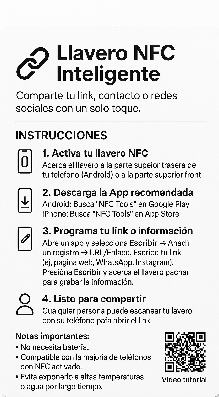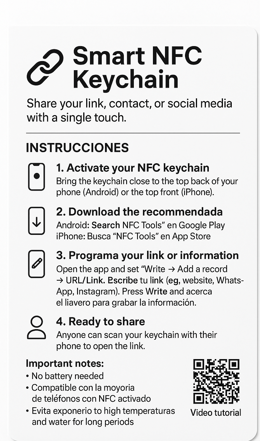 Each keychain comes with a built-in NFC chip, which you can easily program with your own link, contact information, or social media profile. No special tools are required—just a smartphone with NFC enabled, and it’s ready in minutes.